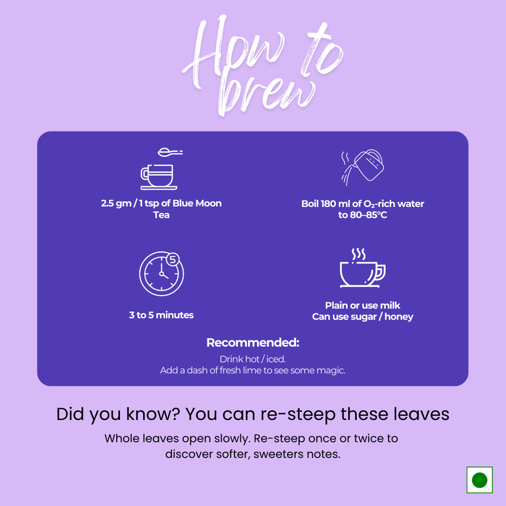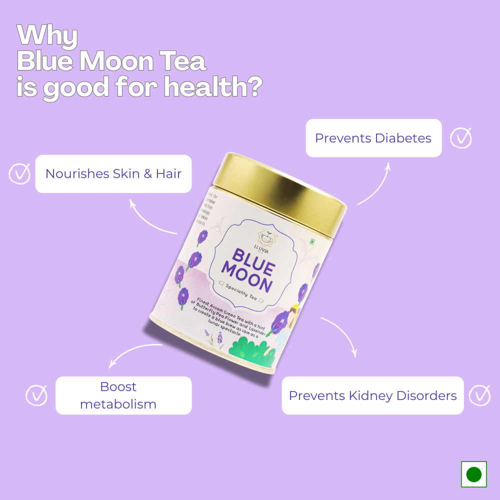 Finest Assam Green Tea with a hint of butterfly pea flower to create a blue brew as rare as a lunar spectacle. Blue Moon is a caffeine-free herbal concoction that is packed with antioxidants—infused with a hint of butterfly pea flower and lavender along with the finest green tea to create a blue brew as rare as a lunar spectacle. Adding lemon juice to the tea changes the pH of the drink, making it change color from deep blue to purple. Blue tea can also be consumed cold as Iced Tea post meals to aid digestion and promote healthy sleep.