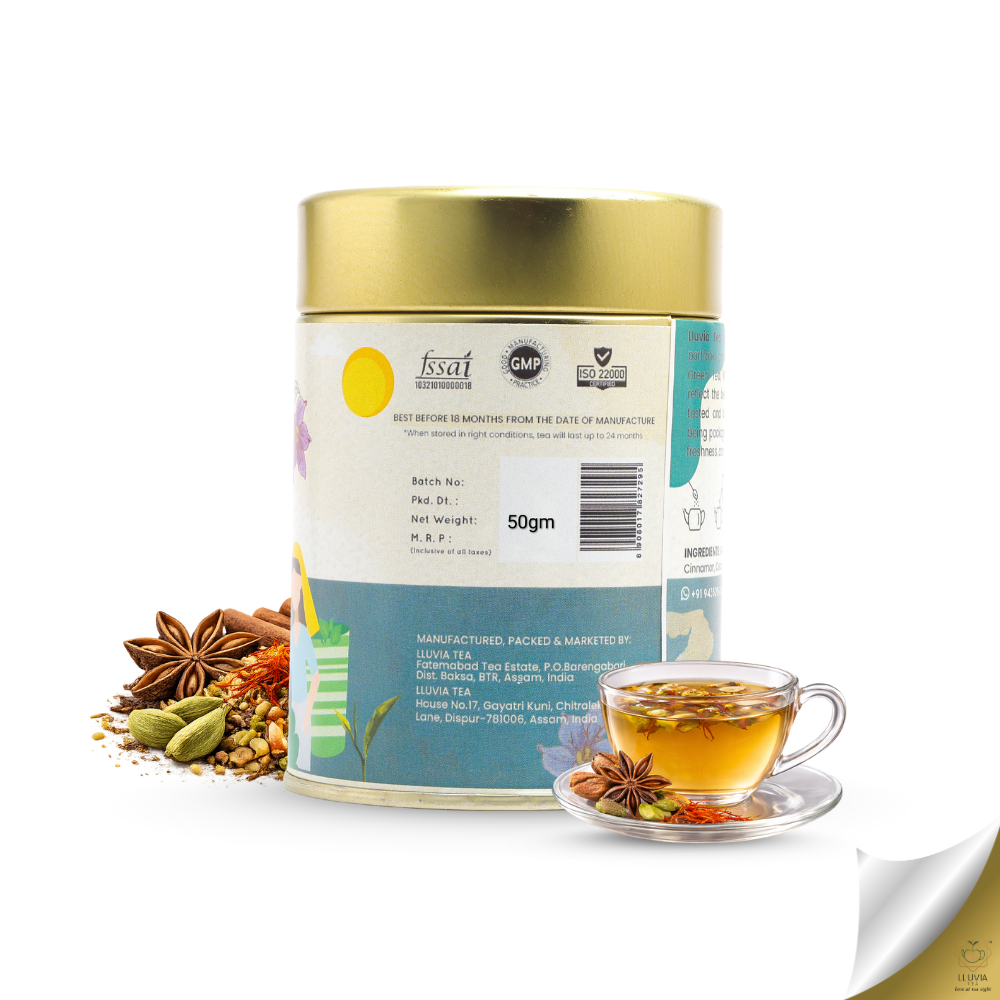 With Peony White tea, Rose Petals, Cardamom, Clove, Cinnamon, Black Pepper, Saffrons, Almonds as its main ingredients, Lluvia Tea's Kashmiri Kahwa Tea gives a very Crimson, Rich, Malty, Sweet after taste.