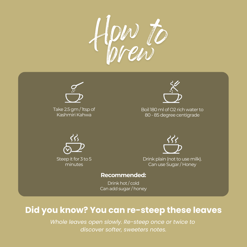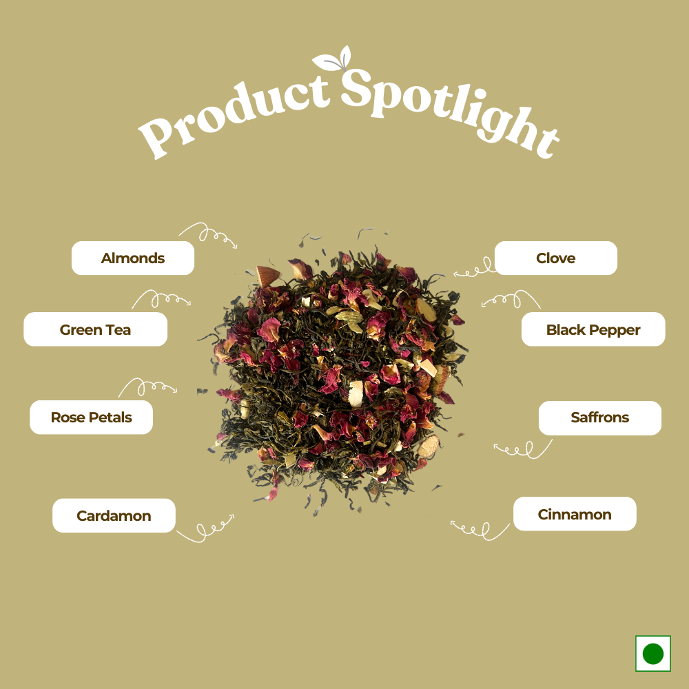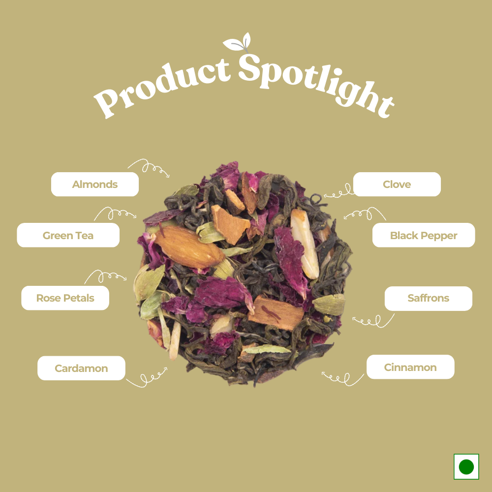 The goodness of green tea, infused with delicate Kashmiri flavours of whole Indian spices. A soul-warming drink that resonates with the blissful serenity of the Kashmir valley. Due to its rich ingredients, the tea also helps in detoxification and is an excellent remedy for cold.
