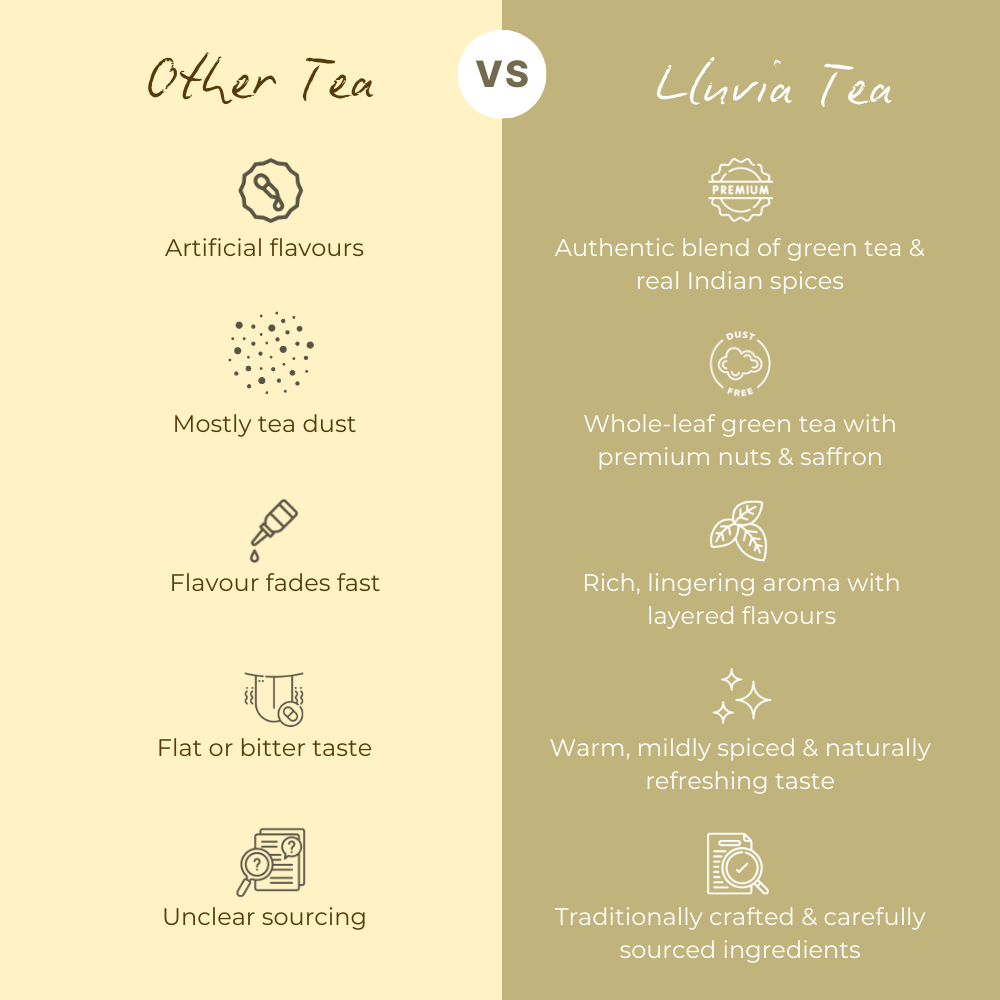 Kashmiri Kahwa is distinctive for its blend of green tea leaves with spices like cardamom, cinnamon, cloves, and often saffron. This combination creates a unique and aromatic flavor profile different from traditional teas.