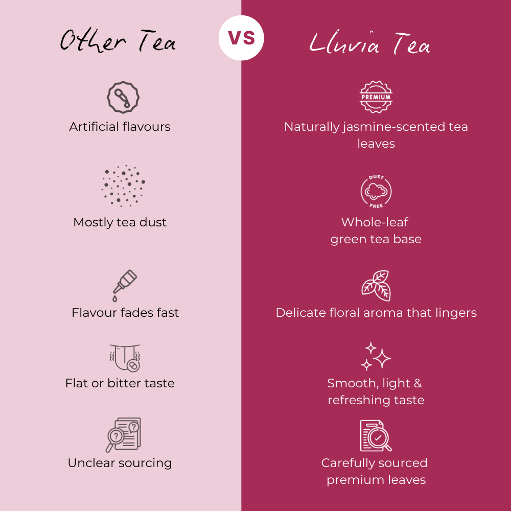 With Green tea leaf and jasmine flower as its ingredients, the Jasmine Tea from Lluvia Tea gives a very floral and subtly sweet aroma.