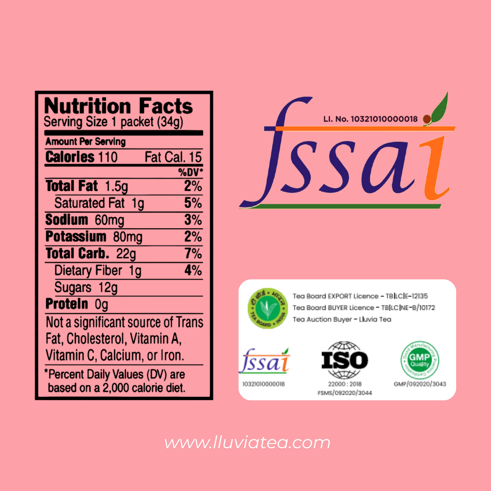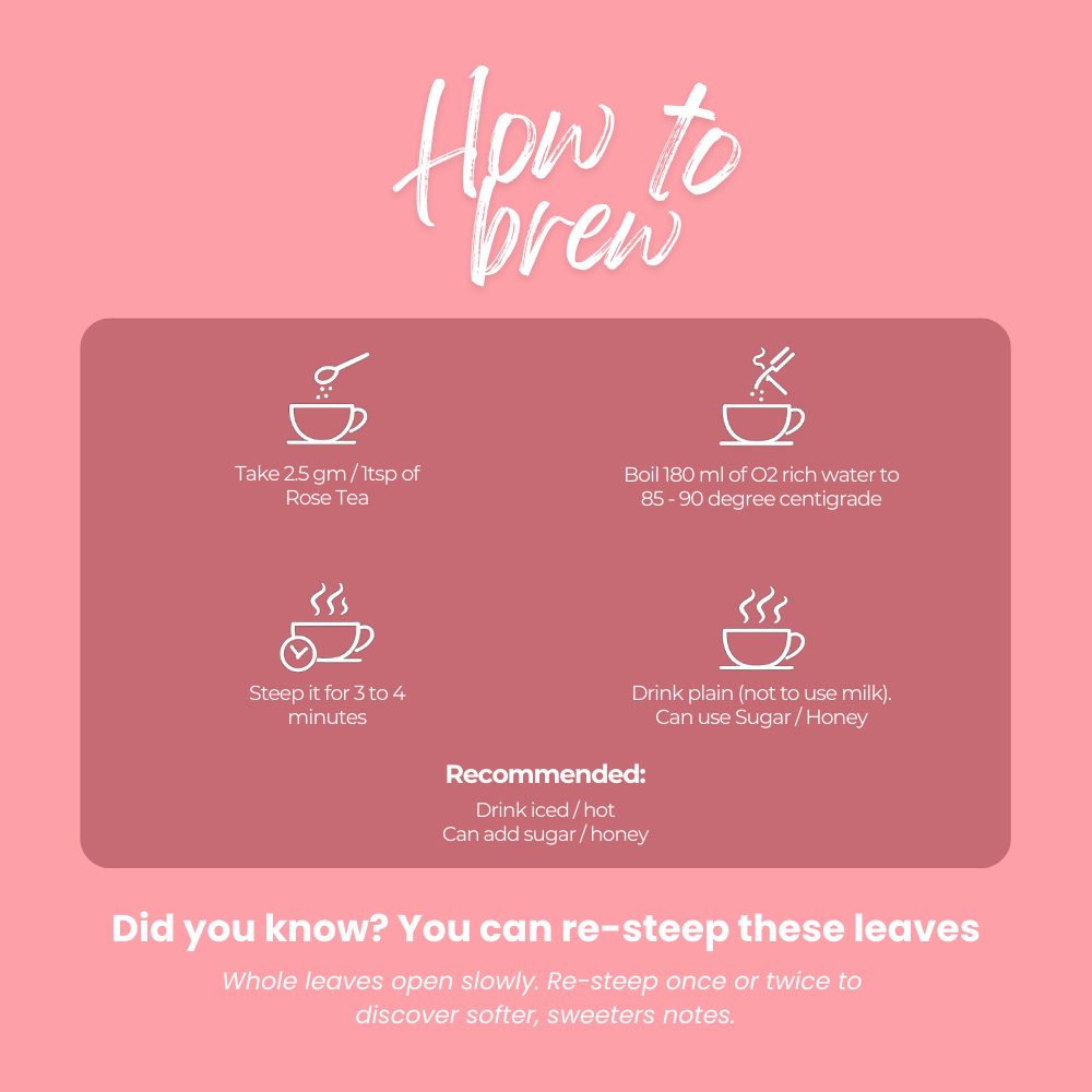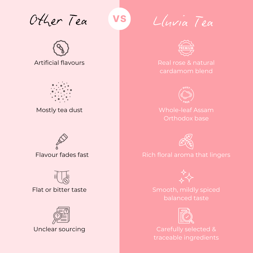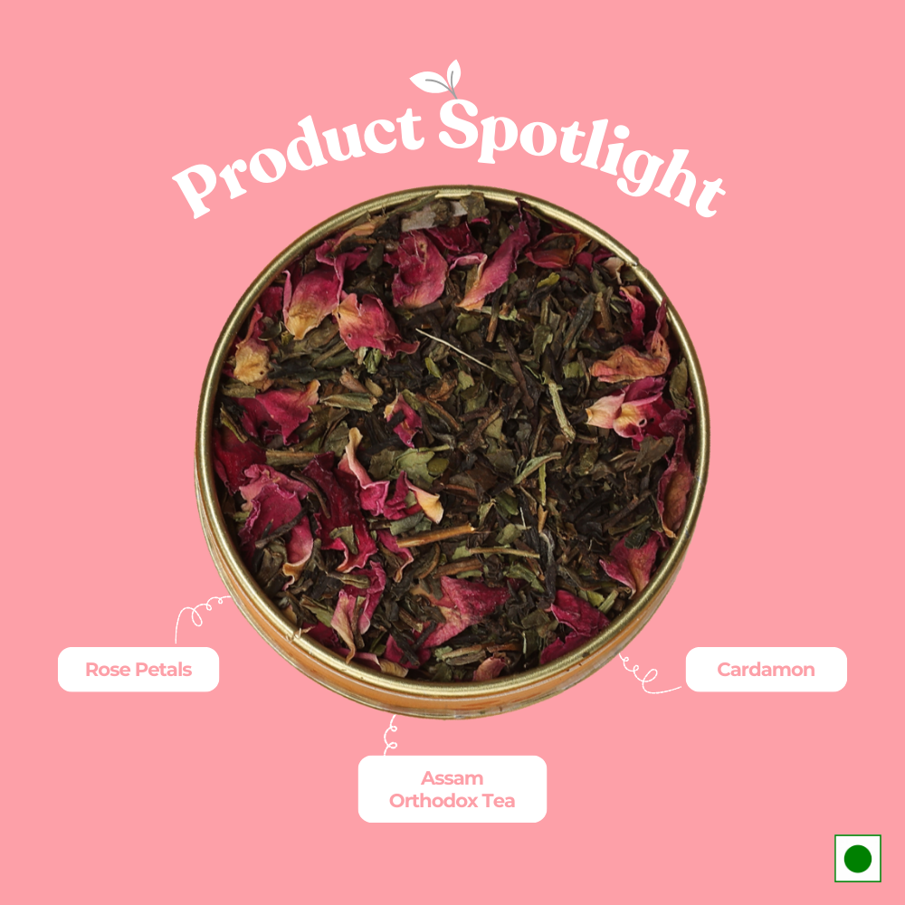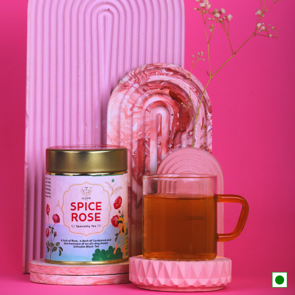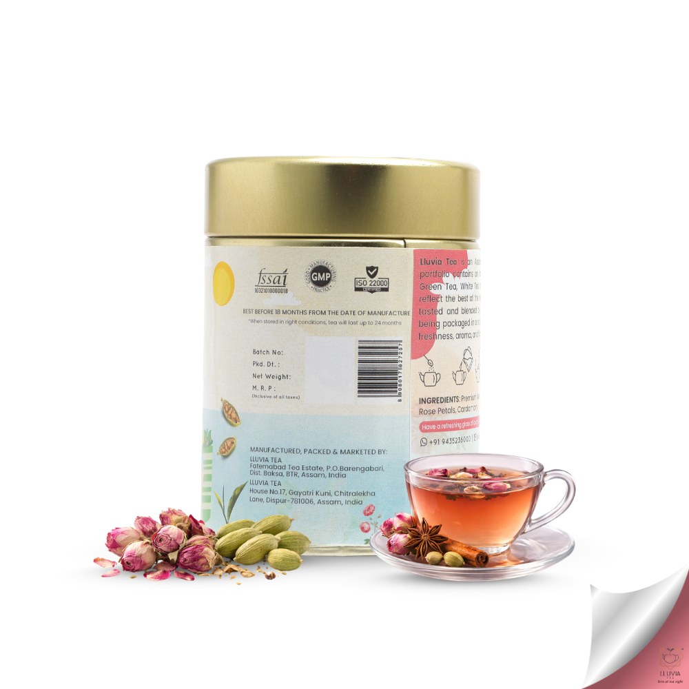 With Premium Assam Orthodox Tea/Organic Rose Petals/ Cardamom as its ingredients, Lluvia Tea's Spice Rose Tea sweet-scented and ambrosial aroma of rose petals.