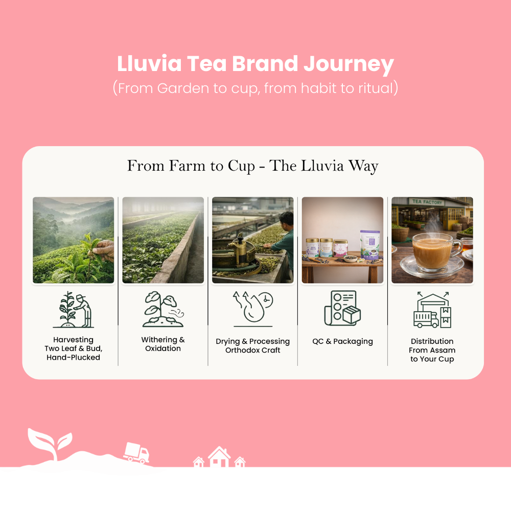 The only Close-to-source facility in India. Lluvia Tea's unique procurement process have our teas arrive within just 3 hours after direct sourcing from our garden. On arrival, they are sealed and packed within 48 hours, ready to be shipped to your doorstep- the world's freshest Indian Tea.