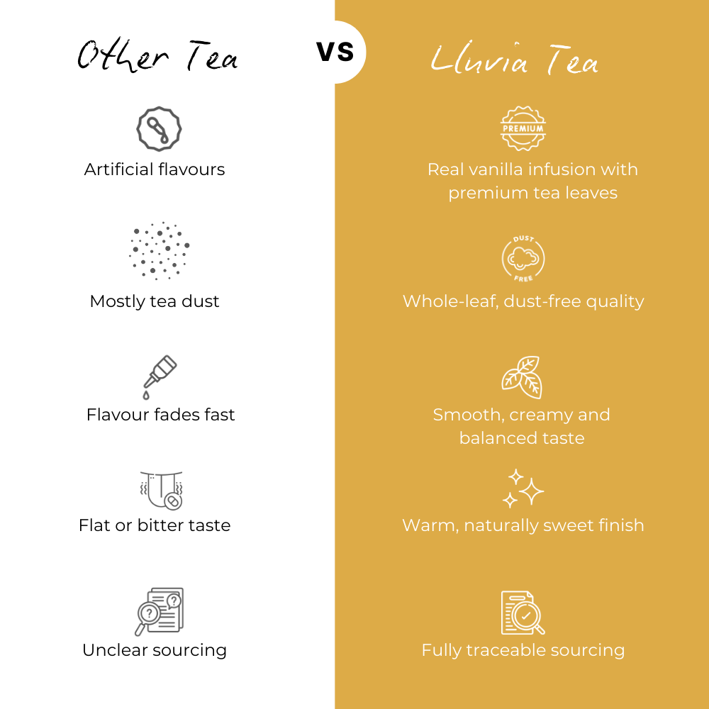 Vanilla Delight Tea is a testament to the artistry of tea blending-The earthy warmth of black tea mingles with the delicate sweetness of vanilla, creating a harmonious union that awakens the senses and soothes the soul. Lluvia Tea's Vanilla Delight tea offers a myriad of health benefits, courtesy of nature's nourishing touch as it is rich in antioxidants and bursting with natural energy.